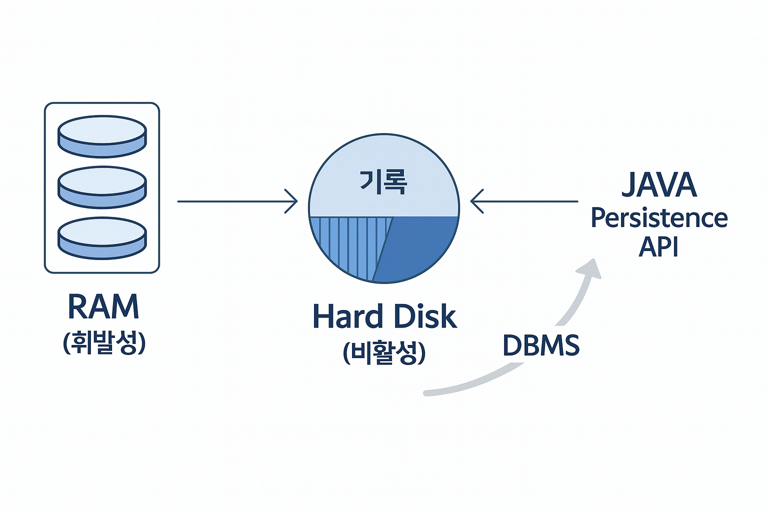 RAM은 휘발성이라 전원이 꺼지면 데이터가 사라지고, 하드디스크는 비휘발성이라 영구 저장된다.