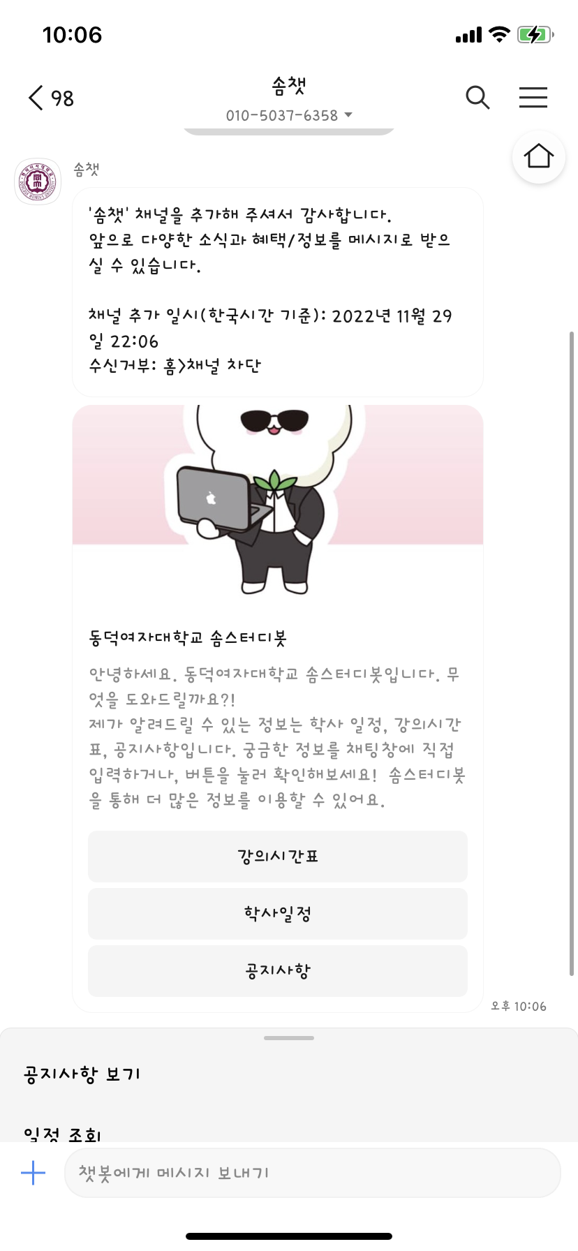 일정조회 눌렀을때 저 멘트가 뜨는데 저 답으로 내가 일정을 검색하세요! 이걸 코드로 구현해뒀는데 안돌아감챗봇의 웰컴메세지의 경우 최초 1회 방문자에게만 보여지게 됩니다. 방문이력이 없는 휴대폰을 가지고 테스트하시면 웰컴메세지가 보여질거에요.
