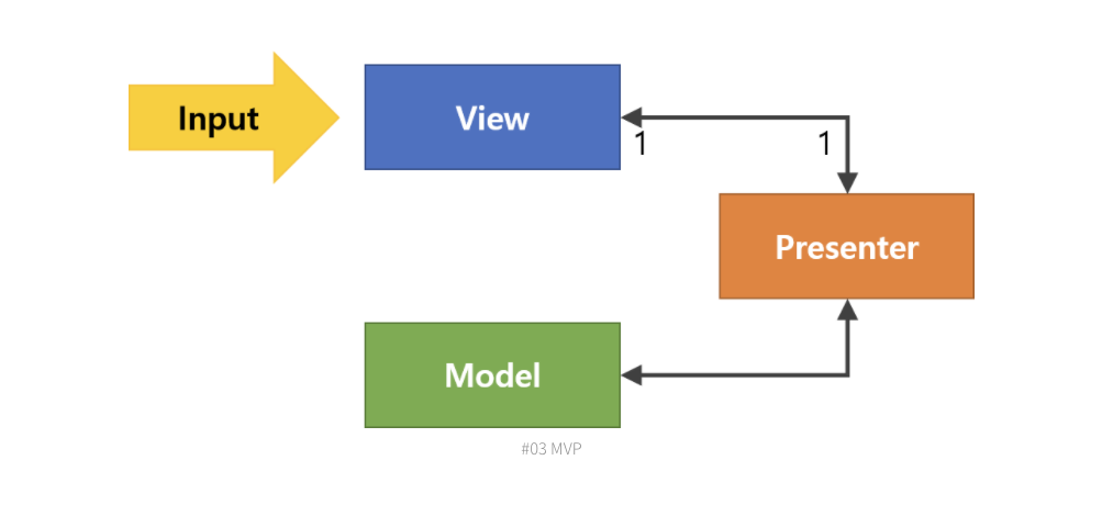 단점: MVP 패턴의 단점은 View와 Model 사이의 의존성은 해결되었지만, View와 Presenter 사이의 의존성이 커진다는 단점이 있습니다. 앱이 복잡해 질 수록 View와 Presenter 사이의 의존성이 강해지는 단점이 있습니다.