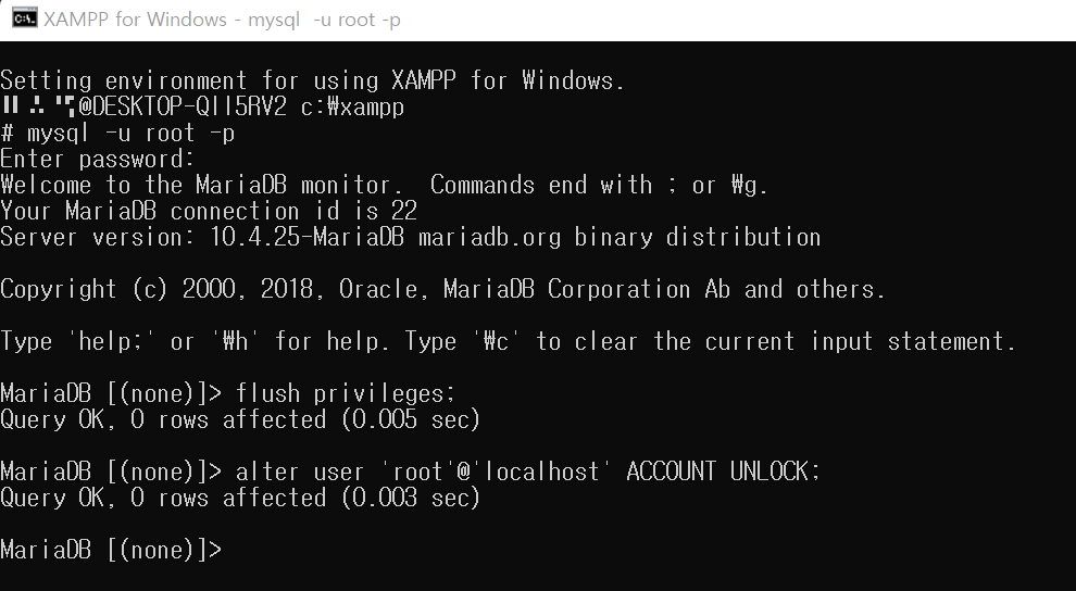 alter user 'root'@'localhost' ACCOUNT UNLOCK; - 그리고. my.ini에 작성한 --skip-grant-table 을 제거 후 종료하시면 됩니다.
