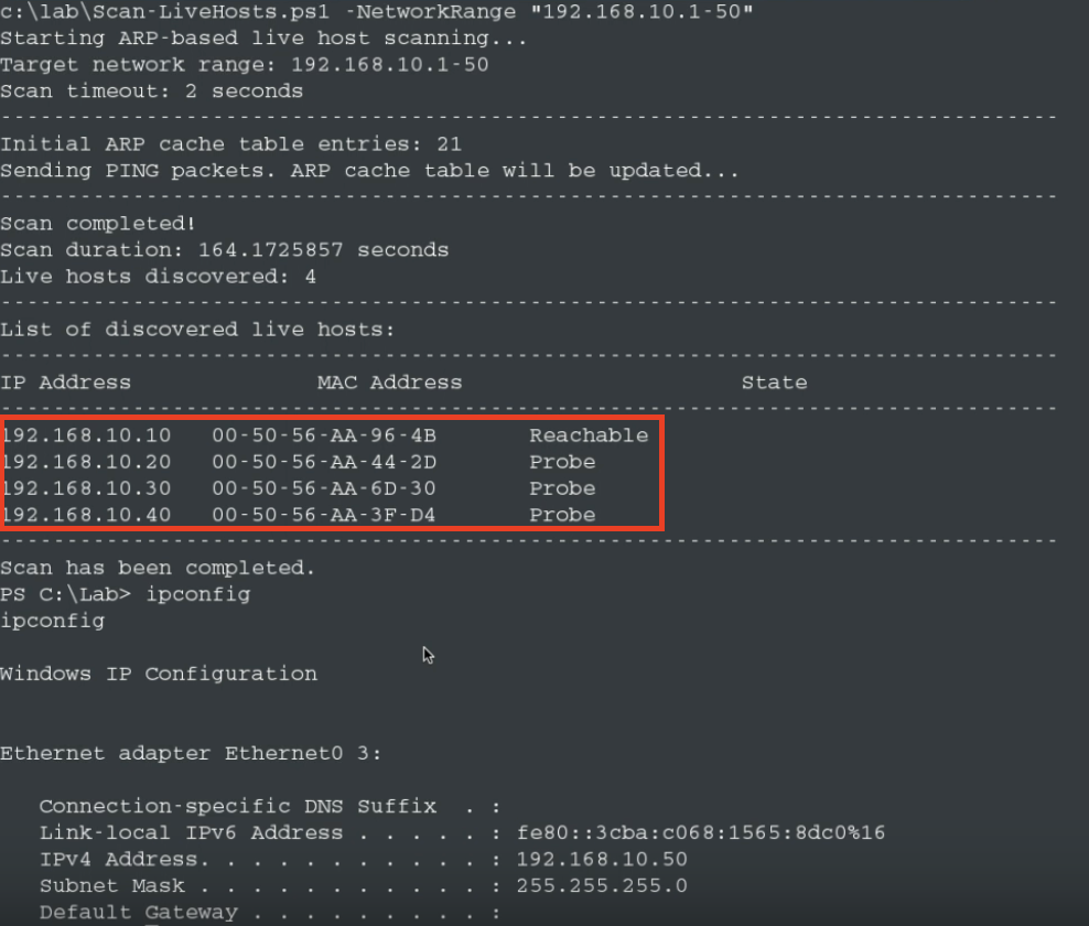 PS C:\Windows\System32\> c:\lab\Scan-LiveHosts.ps1 -NetworkRange "192.168.10.1-50"