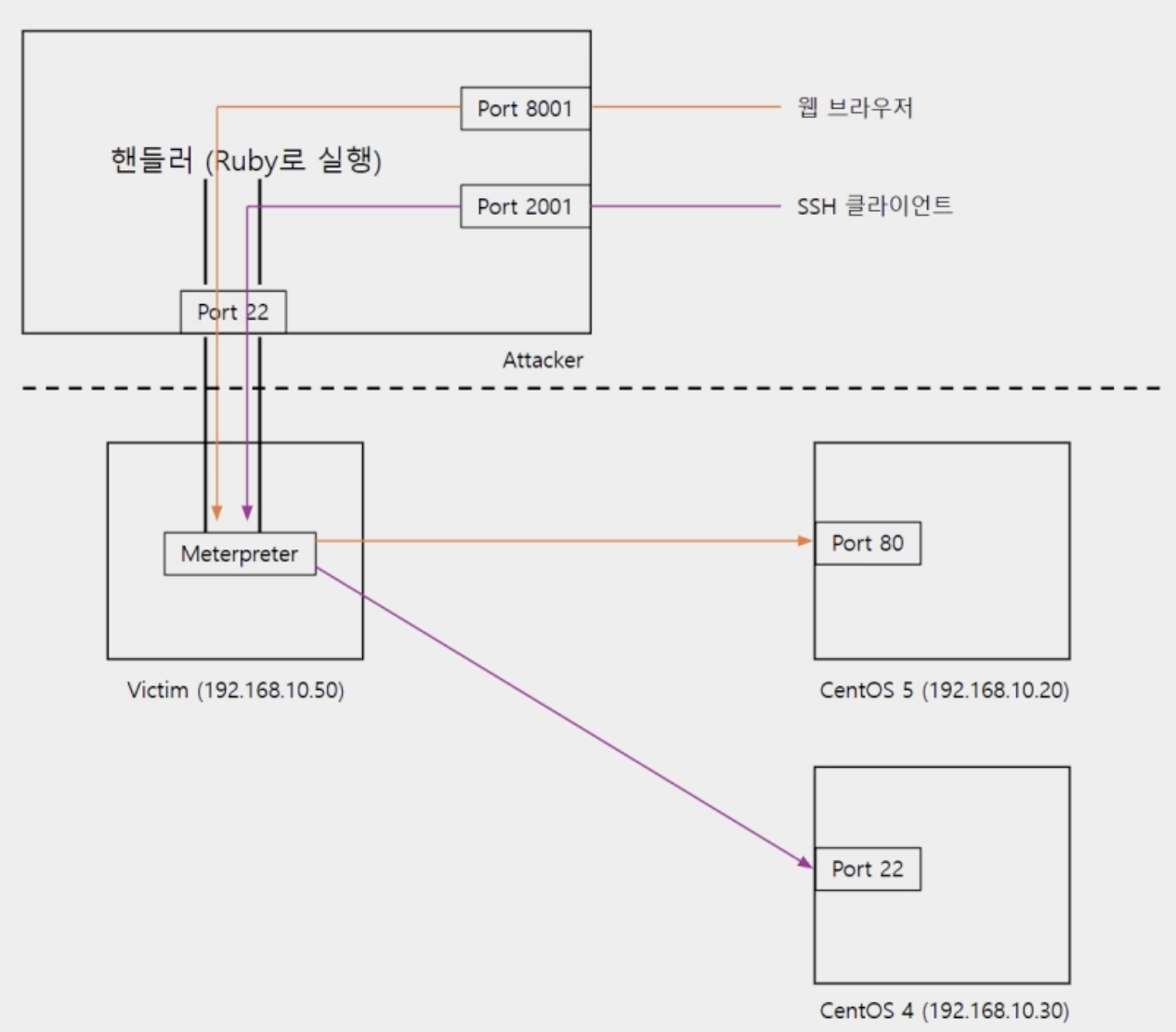 - 공격자시스템(Attacker)은 미터프리터의 포트 포워딩 기능을 이용하여 표적 네트워크에 있는 각 시스템에 다음과 같이 접근이 가능하도록 조치합니다.
