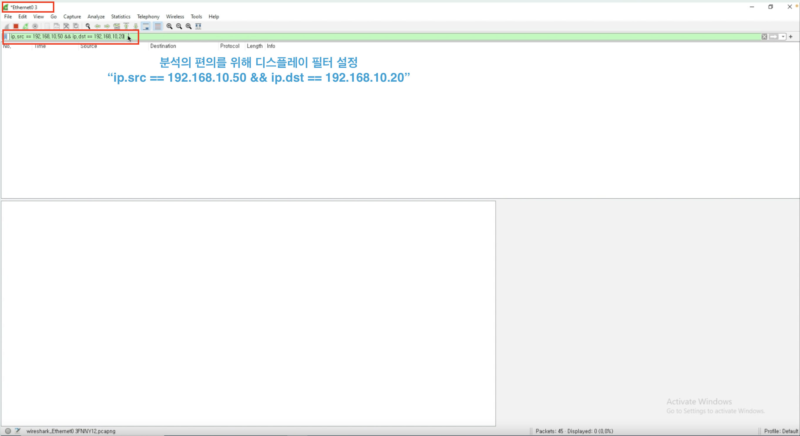 - 포트 포워딩이 제대로 실행되었는지 여부를 확인하기 위해 표적시스템(Victim) 내에서 패킷 모니터링 프로그램(Wireshark)를 실행합니다. (본 실습 환경에서는 "Ethernet0 3" 인터페이스 모니터링)