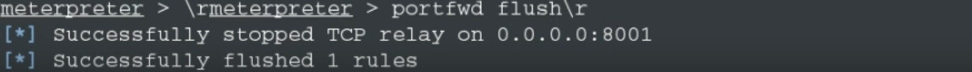 - 접속이 원활히 수행되는 것을 확인하였다면 이후 실습의 안정성을 위해 포트 포워딩 설정을 초기화합니다. (본 실습 예제에서는 미터프리터 쉘의 "portwd flush" 명령어 사용)
