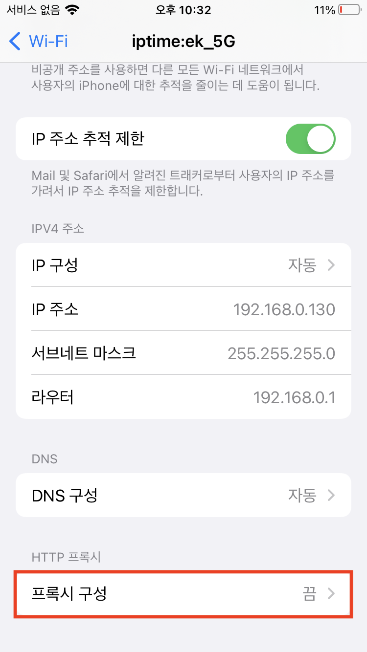- iOS의 Wi-Fi 설정에 들어가면 제일 밑에 프록시 구성이라는 탭이 있다.