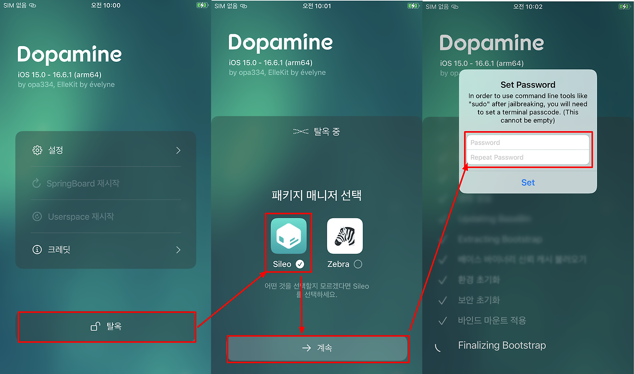 → 계속 누르면 탈옥이 진행되고 sudo의 패스워드를 설정해야 하는데 자기가 외울 수 있는 패스워드로 설정해야한다. (단말기와 SSH 연결할 때 등등 필요로 한다.) 그러면 휴대폰 재시작이 시작되며 탈옥이 성공적으로 된다.