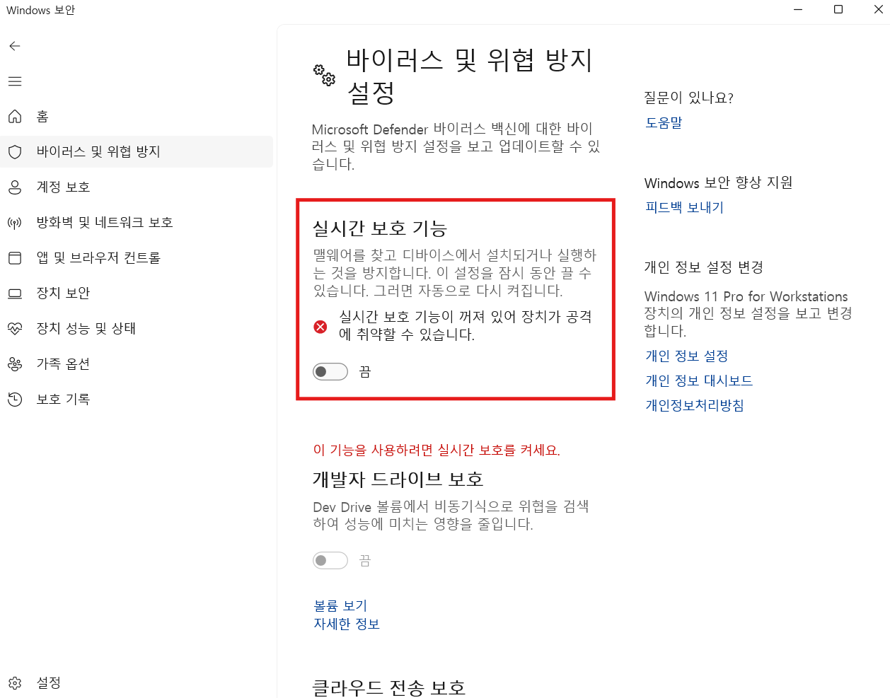 - 그래도 안되면 클라우드 전송 보호, 자동 샘플 전송, 변조 보호도 다 꺼본다.
