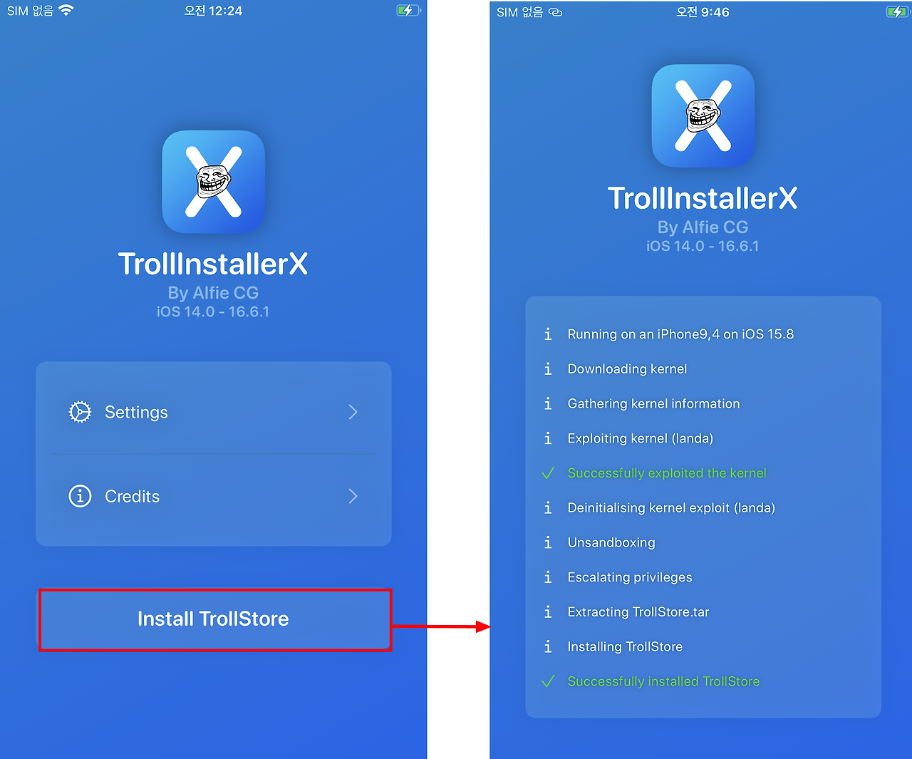 'TrollInstallerX > Install TrollStore' 클릭하여 설치 진행한다.