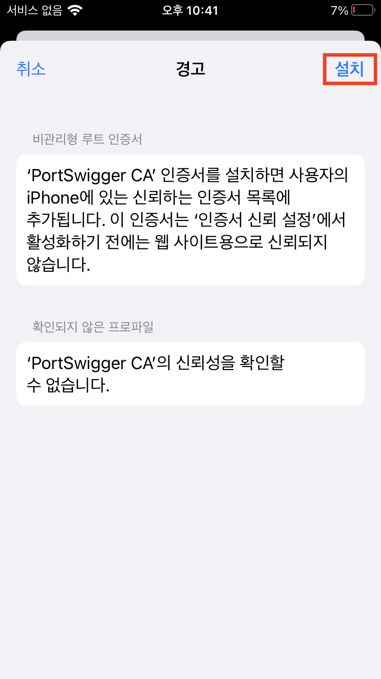 7) 설정 > 일반 > 정보 > 인증서 신뢰 설정 > PortSwigger CA 활성화