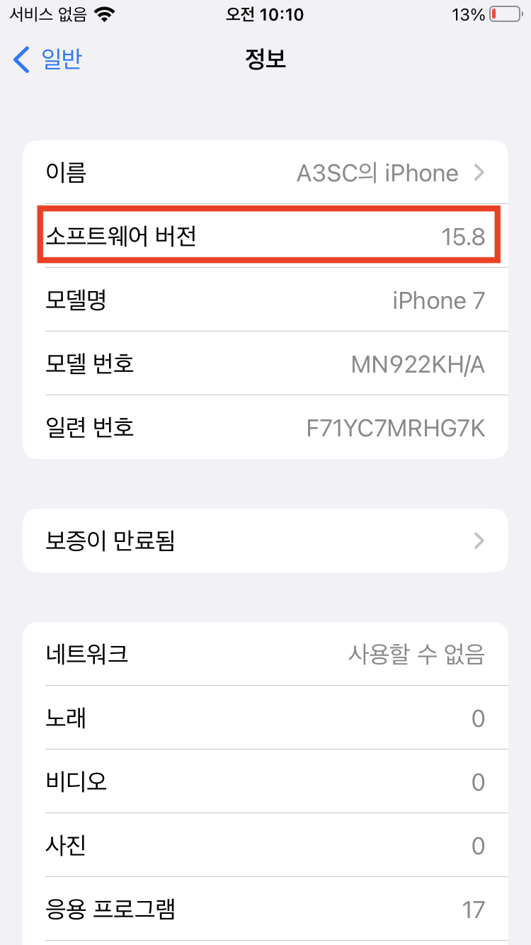 설정에서 자신의 iOS 버전을 확인한다.