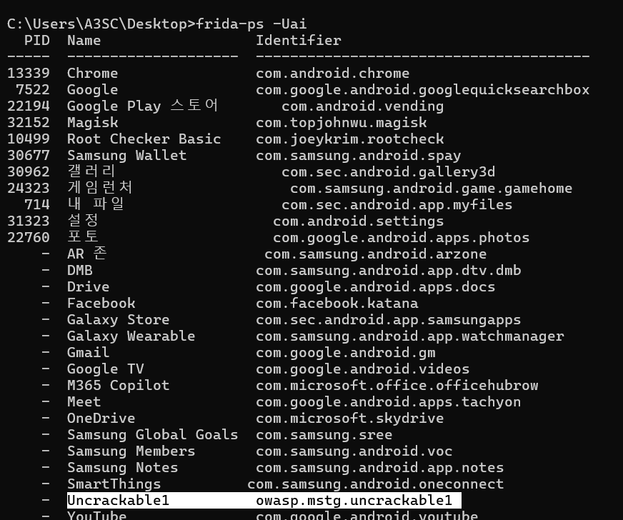 frida-ps -Uai // 프로세스 패키지 이름 확인