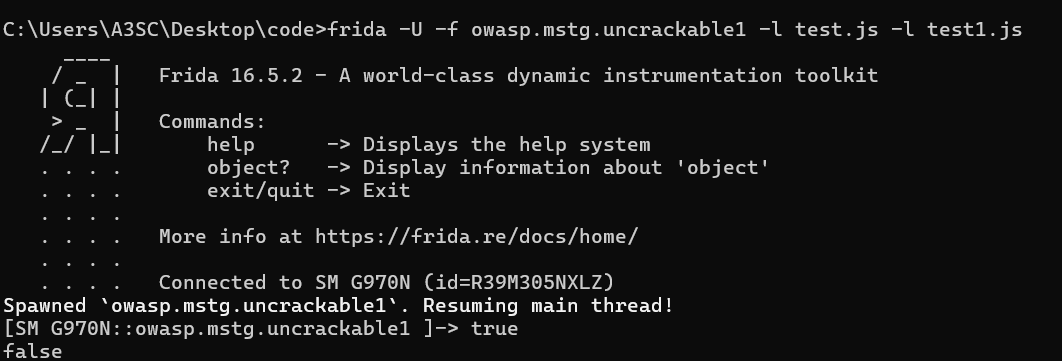 frida -U -f owasp.mstg.uncrackable1 -l test.js -l test1.js