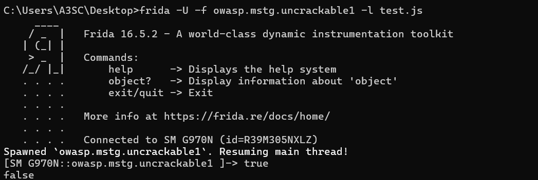 frida -U -f owasp.mstg.uncrackable1 -l test.js//js파일 실행