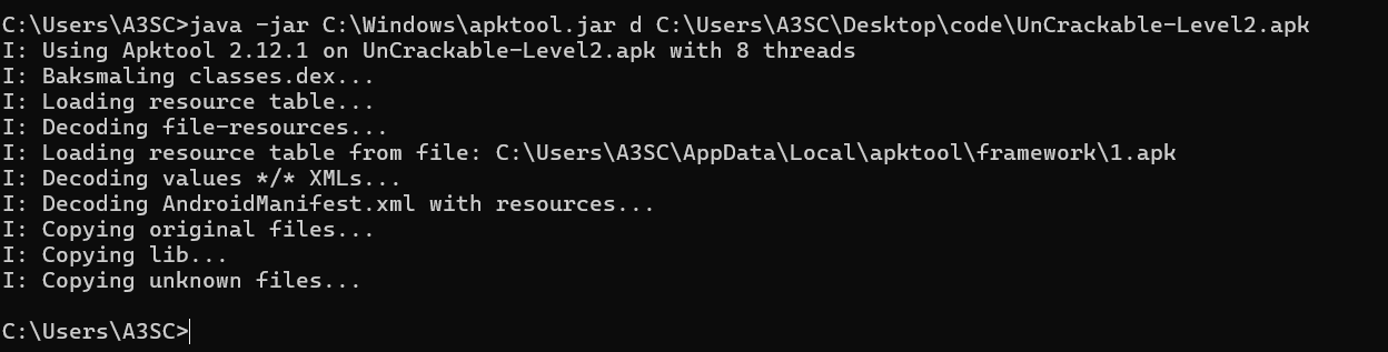java -jar C:\Windows\apktool.jar d C:\Users\A3SC\Desktop\code\UnCrackable-Level2.apk