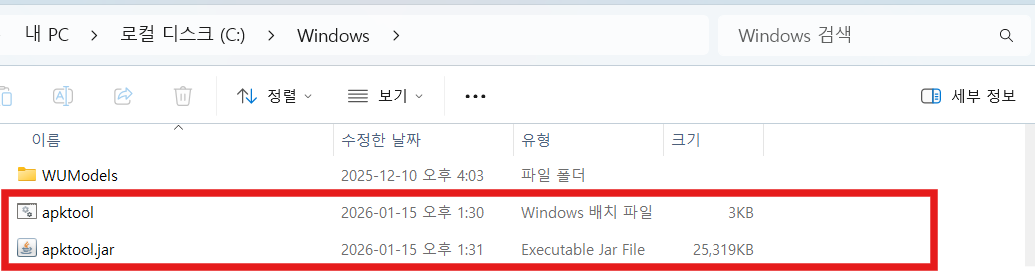 이때 파일의 버전명을 지우고 이름을 apktool.jar로 바꾸어서 C:\windows 경로에 둠